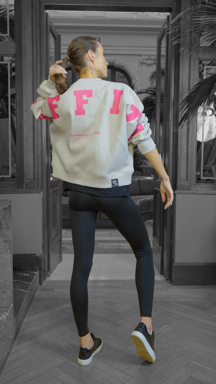 Barva stone působí čistě, elegantně a nadčasově. Zkrácený cropped střih krásně pracuje s postavou a kontrastní růžový nápis LAFFITA dodává odvahu i charakter.